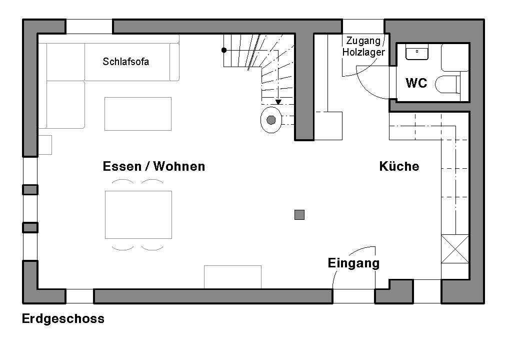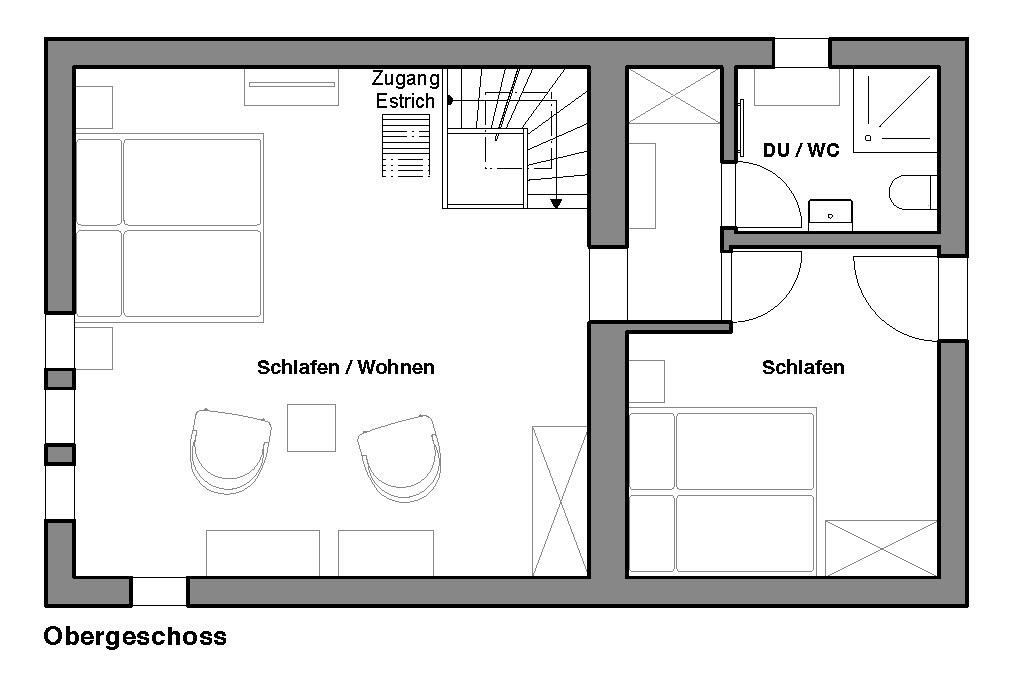 Das Haus hat sechs Schlafplätze. Im Estrich sind zwei Betten, im Obergeschoss hat es zwei Doppelbetten, zudem kann im Parterre das Sofa zu einem weiteren Doppelbett umfunktioniert werden.